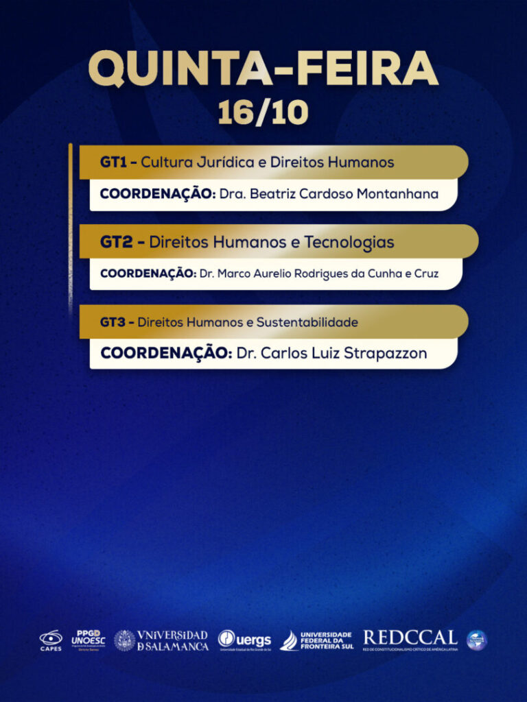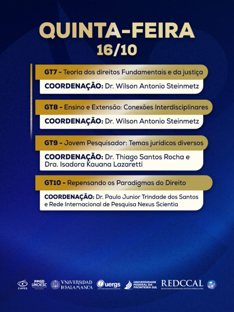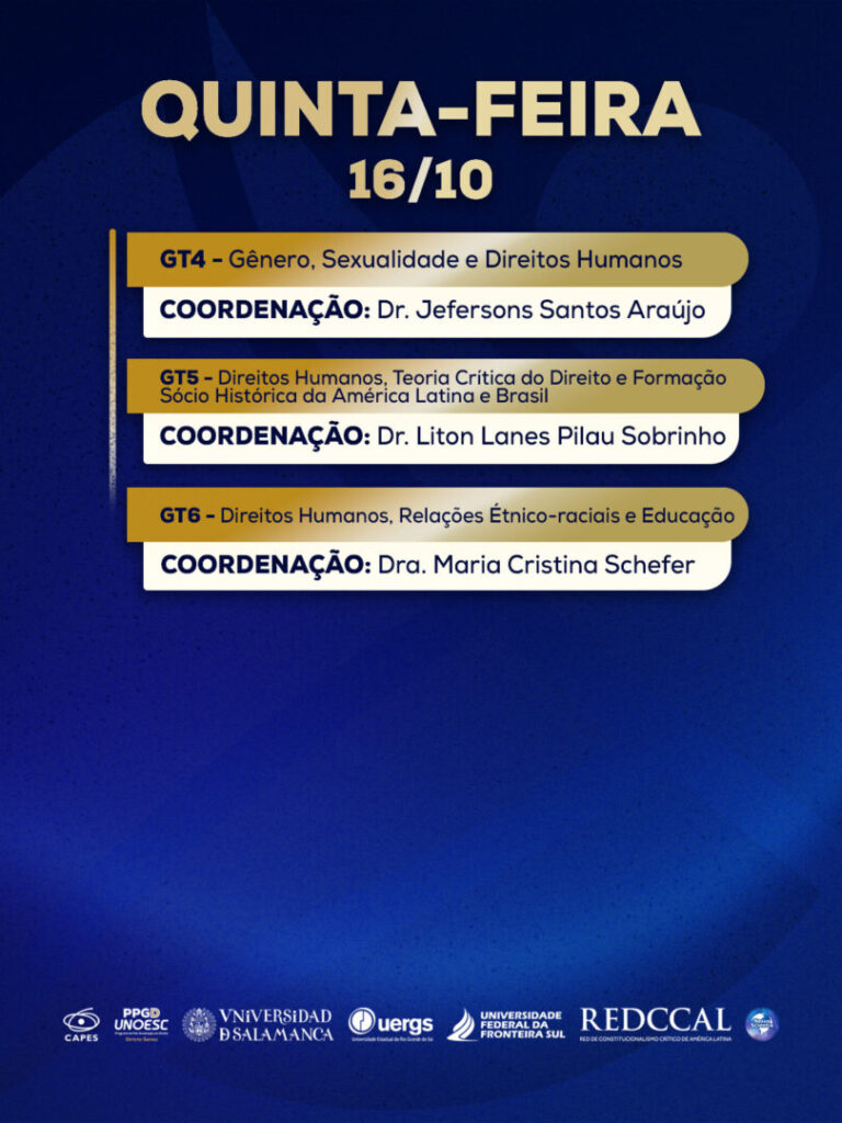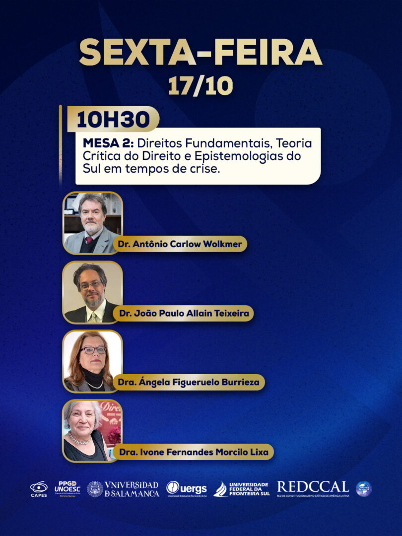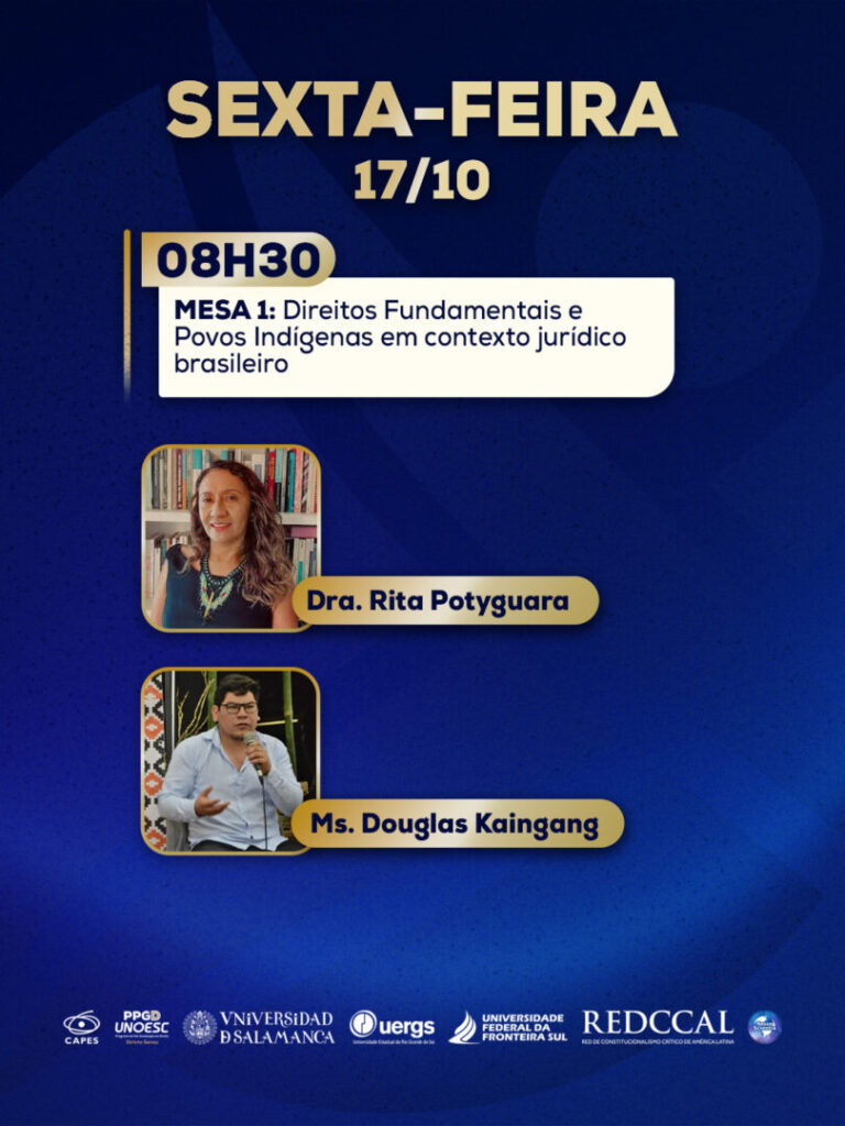 No dia 17 de outubro, iniciam as mesas temáticas. Pela manhã, das 8h30 às 12h, será discutido o tema “Direitos fundamentais e Povos Indígenas em contexto jurídico brasileiro”, com a participação do professor Douglas Kaingang (Universidade Federal do Paraná – UFPR) e da professora Rita Potyguara (Faculdade Latino-Americana de Ciências Sociais – FLACSO), e também “Direitos Fundamentais, Teoria Crítica do Direito e Epistemologias do Sul em tempos de crise”, com a professora Ángela Figueruelo Burrieza (USAL), professor Antônio Carlos Wolkmer (Centro Universitário La Salle – Unilasalle) e professor João Paulo Allain Teixeira (Universidade Federal de Pernambuco – UFPE).