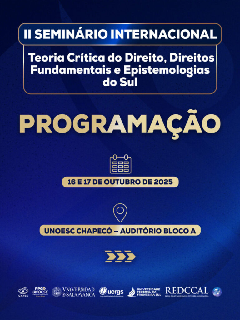 A Unoesc sediará o “2º Seminário Internacional Teoria Crítica do Direito, Direitos Fundamentais e Epistemologias do Sul”, um evento acadêmico-científico que ocorrerá nos dias 16 e 17 de outubro. O seminário, organizado em parceria com a Coordenação de Aperfeiçoamento de Pessoal de Nível Superior (CAPES), com o Programa de Pós-graduação em Direito (PPGD) da Unoesc, a Cátedra Espanha e Brasil e a Universidade de Salamanca (USAL), visa consolidar um espaço internacional para o debate crítico e reflexivo e a produção de conhecimento interdisciplinar.