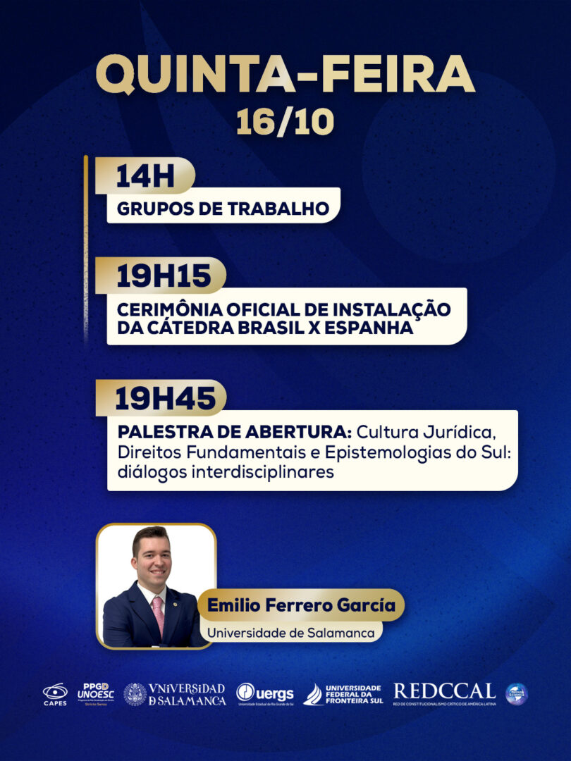 As atividades iniciam no dia 16 de outubro com grupos de trabalho das 14h às 17h30, e temas como “Cultura Jurídica e Direitos Humanos”, “Direitos Humanos e Tecnologias”, e “Gênero, Sexualidade e Direitos Humanos”. À noite, a partir das 19h15, ocorrerá a cerimônia oficial de instalação da Cátedra Brasil e Espanha e uma palestra de abertura com o professor Emilio Ferrero García, da USAL, sobre “Cultura Jurídica, Direitos Fundamentais e Epistemologias do Sul: diálogos interdisciplinares”.