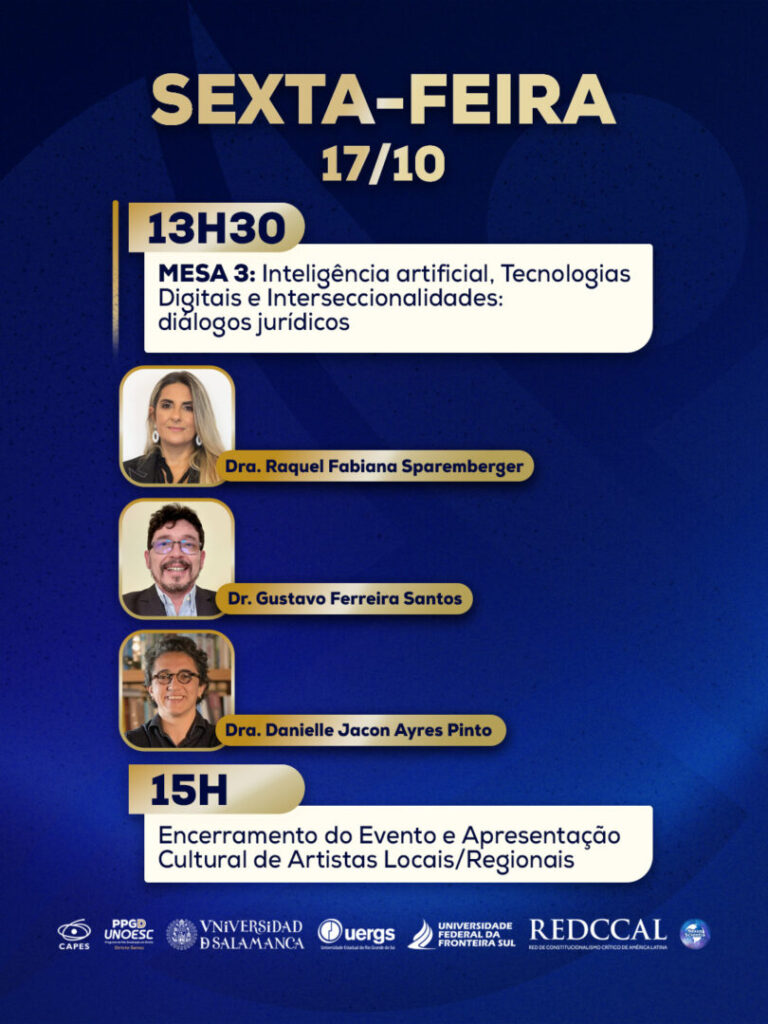 No período da tarde, das 13h30 às 15h, a discussão se concentrará em “Inteligência Artificial, Tecnologias Digitais e Interseccionalidades: diálogos jurídicos”, com a participação da professora Ivone Fernandes Morcilo Lixa (Universidade Regional de Blumenau – FURB), da professora Raquel Fabiana Sparemberger (Ministério Público do Rio Grande do Sul – MPRS), professor Gustavo Ferreira Santos (Universidade Católica de Pernambuco – UNICAP) e professora Danielle Jacon Ayres Pinto (Universidade Federal de Santa Catarina – UFSC).
