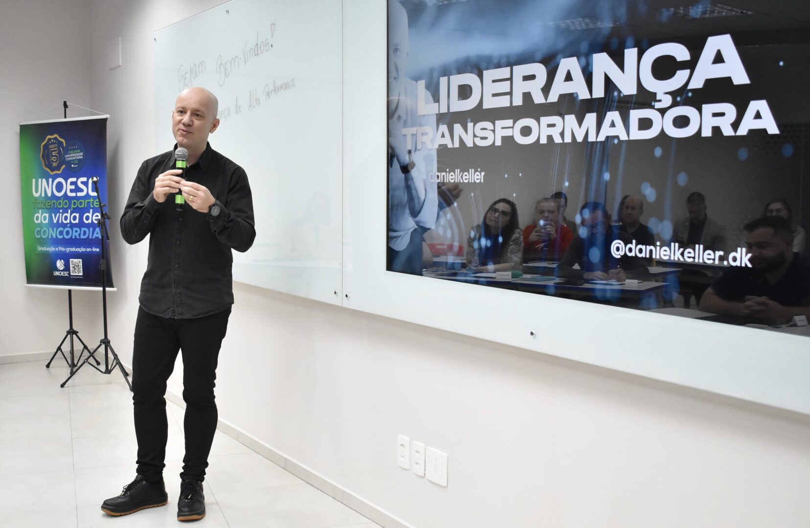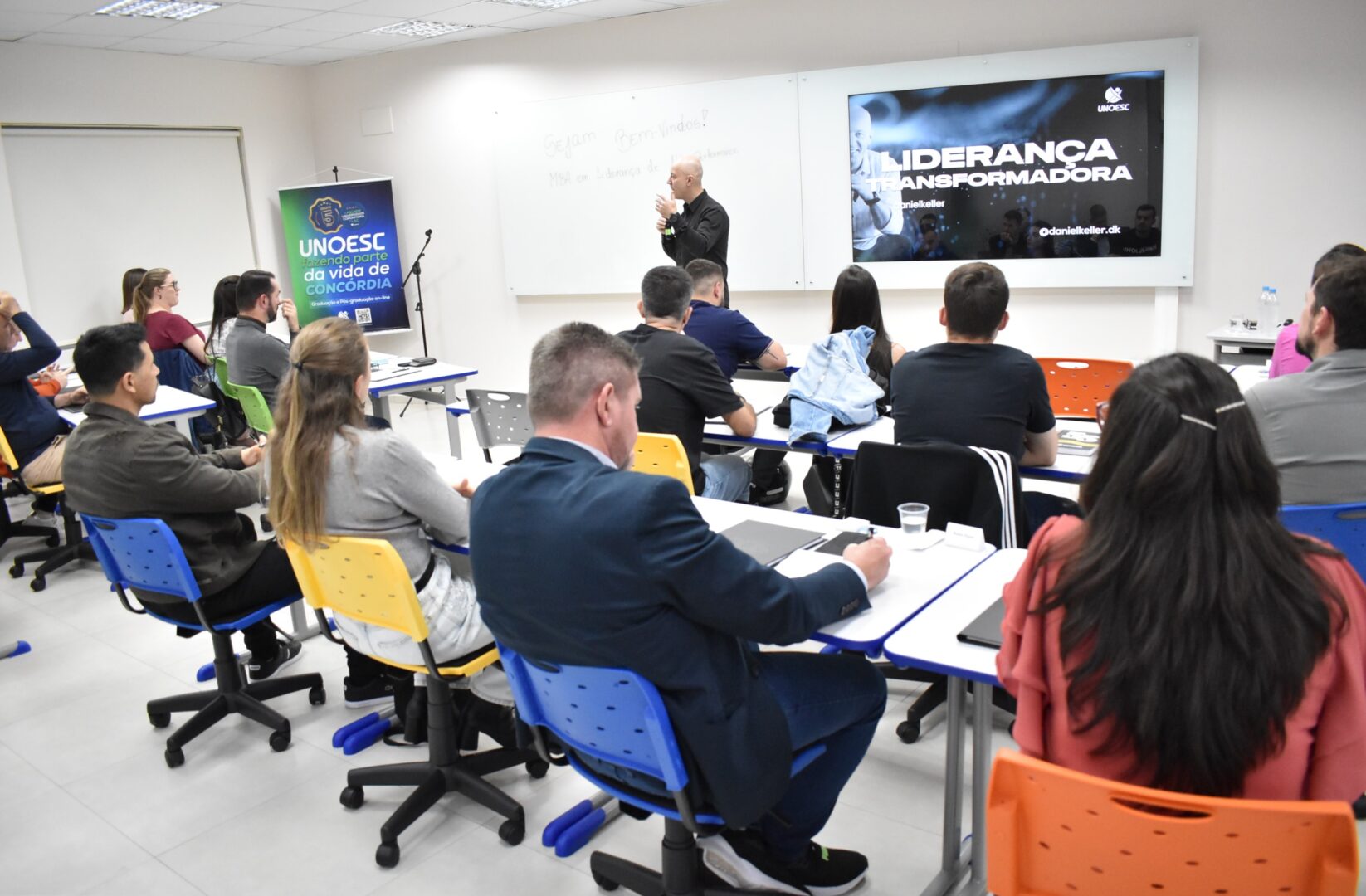 A aula inaugural foi marcada pela palestra “Liderança Transformadora”, ministrada por Daniel Keller. Autor do livro “Antes de tudo, pessoas” e especialista em Neurociência e Educação, em Neuromarketing e em Gestão de Pessoas, ele compartilhou a sua vivência como consultor, mentor e palestrante com 17 anos de experiência em projetos de desenvolvimento e evolução de pessoas e negócios.