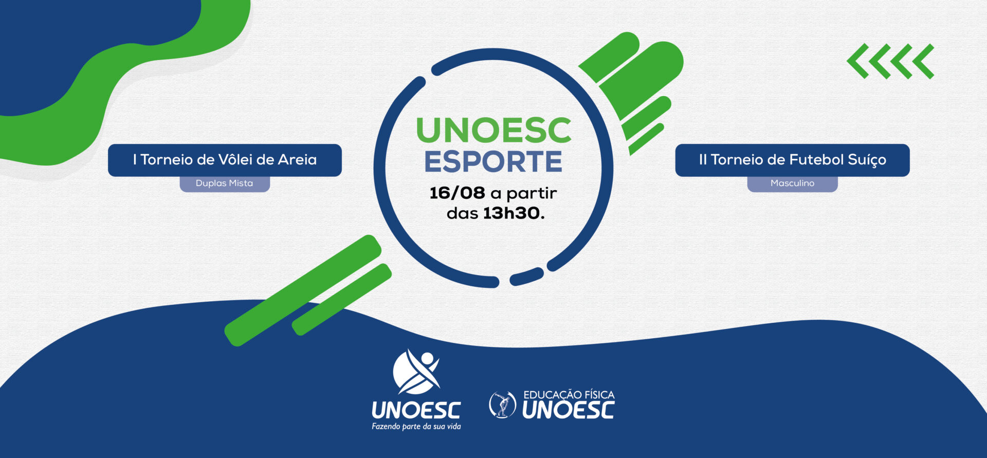 O “Unoesc Esporte” do mês de agosto será marcado pelo 2º Torneio de Futebol Suíço Masculino, voltado para egressos, estudantes, professores e colaboradores da Universidade, e pelo 1º Torneio de Vôlei de Areia Dupla Mista, aberto para o público em geral. As inscrições são gratuitas e podem ser feitas no local.