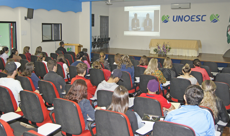 Durante o primeiro encontro, a professora Rita de Cássia Soares, gerente da 9ª Gerência Regional de Educação (Gered), com quem a universidade mantém diversas parcerias, esteve presente prestigiando a aula inaugural da Unoesc Videira.