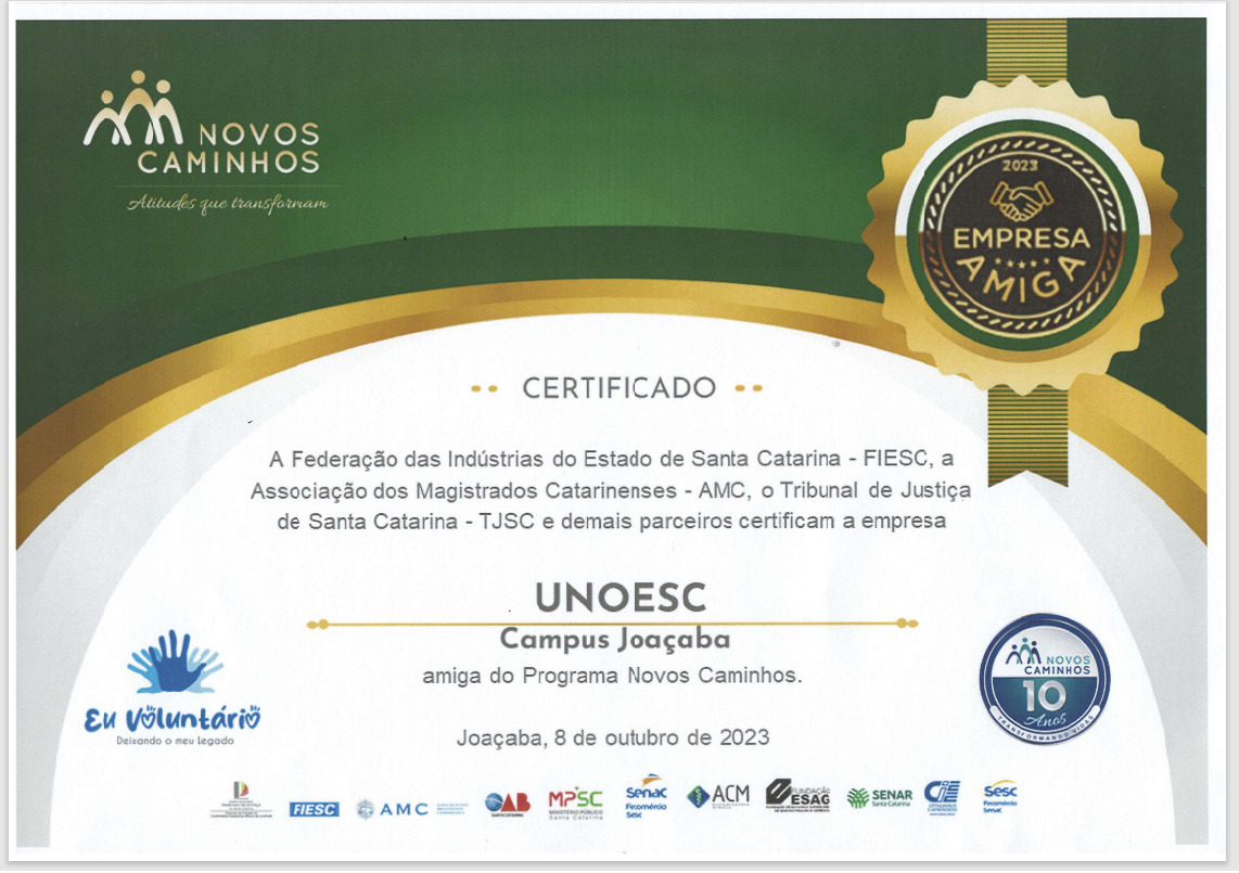Pelo segundo ano consecutivo, a Unoesc Joaçaba é certificada como “Empresa Amiga” do Programa Novos Caminhos. A homenagem foi recebida na última semana, pela coordenadora de Recursos Humanos da Universidade, Lígia Krühs Zulian, em evento no Senai Luzerna promovido pela Federação das Indústrias de Santa Catarina (FIESC), pela Associação dos Magistrados Catarinenses (AMC) e pelo Tribunal de Justiça de Santa Catarina.
