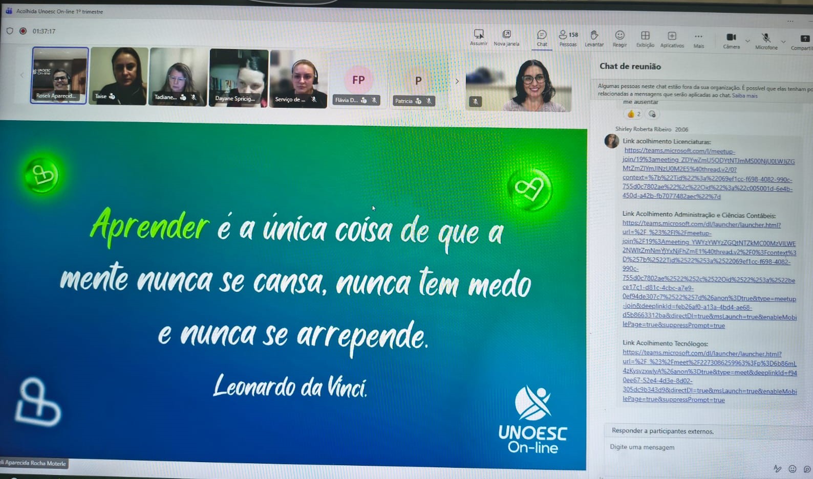 Participaram integrantes da equipe da Unoesc On-line, dirigentes e estudantes. Durante a programação, os participantes acompanharam um vídeo do reitor, professor Ricardo Antonio De Marco, e a fala da pró-reitora de Ensino, professora Jaciney Aparecida Danielli.