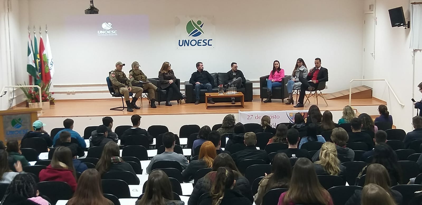 A coordenação do curso de Psicologia da Unoesc Pinhalzinho, em conjunto com o Conselho Municipal dos Direitos da Mulher e da Secretaria de Assistência Social, com apoio do curso de Direito da Unoesc Pinhalzinho, promoveu, nesta segunda-feira (29), uma Roda de Conversa alusiva ao Agosto Lilás. Com o tema: “Ouvir, Acolher e Empoderar!”, o evento foi aberto à comunidade e contou com a presença de aproximadamente 130 pessoas. A atividade recebeu o apoio de diversas instituições representativas da sociedade, como a Polícia Militar, Polícia Civil e Poder Judiciário.
