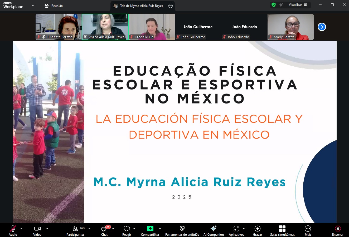 Durante o encontro, Myrna compartilhou experiências sobre as realidades escolares mexicanas, as diferenças culturais e os desafios enfrentados na promoção da atividade física em um contexto de limitações estruturais e sociais. Entre os temas abordados, destacaram-se as transformações recentes no sistema educacional mexicano com a implantação da “Nova Escola Mexicana”, baseada em projetos e princípios como inclusão, motricidade e vínculo comunitário.