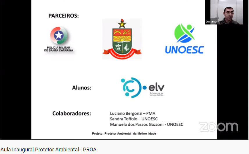 O evento foi transmitido ao vivo pelo youtube e a abertura foi realizada pelo Sargento Luciano Bergonzi que apresentou o Programa para os convidados e contou também com a Professora Manuela Gazzoni dos Passos que envolveu os convidados comentando sobre o impacto das ações de Sustentabilidade desenvolvidas pela Unoesc.