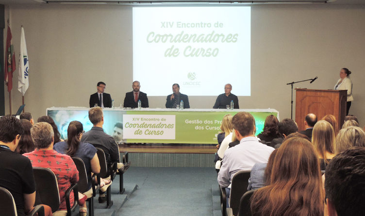 Na manhã desta segunda-feira (6), ocorreu a 14ª edição do Encontro de Coordenadores de Curso da Unoesc, no auditório da Saúde, localizado no campus 2 de Joaçaba. A universidade trabalha na busca contínua da melhoria da qualidade de ensino, pesquisa e extensão dos cursos, e são os coordenadores, os grandes responsáveis pela gestão deste processo. Sendo assim, o evento foi organizado para que eles possam refletir sobre as suas ações e melhorar as condições da gestão e da prática pedagógica.