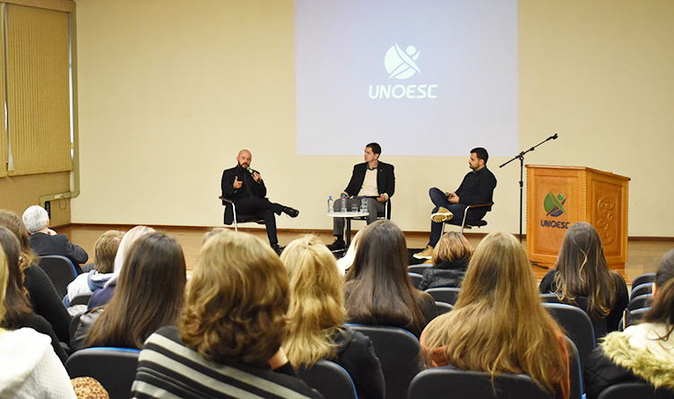 Na segunda parte do evento, o coordenador do curso de Publicidade e Propaganda, professor Paulo Ricardo dos Santos, fez a mediação do bate-papo com dois diplomados da Unoesc, Luiz Henrique Bareta, graduado em Direito, e Guilherme Kasperbauer, formado em Medicina. Na ocasião, eles contaram aos novos estudantes como trilharam seus caminhos na graduação, onde estão atuando e como está o mercado de trabalho atualmente.