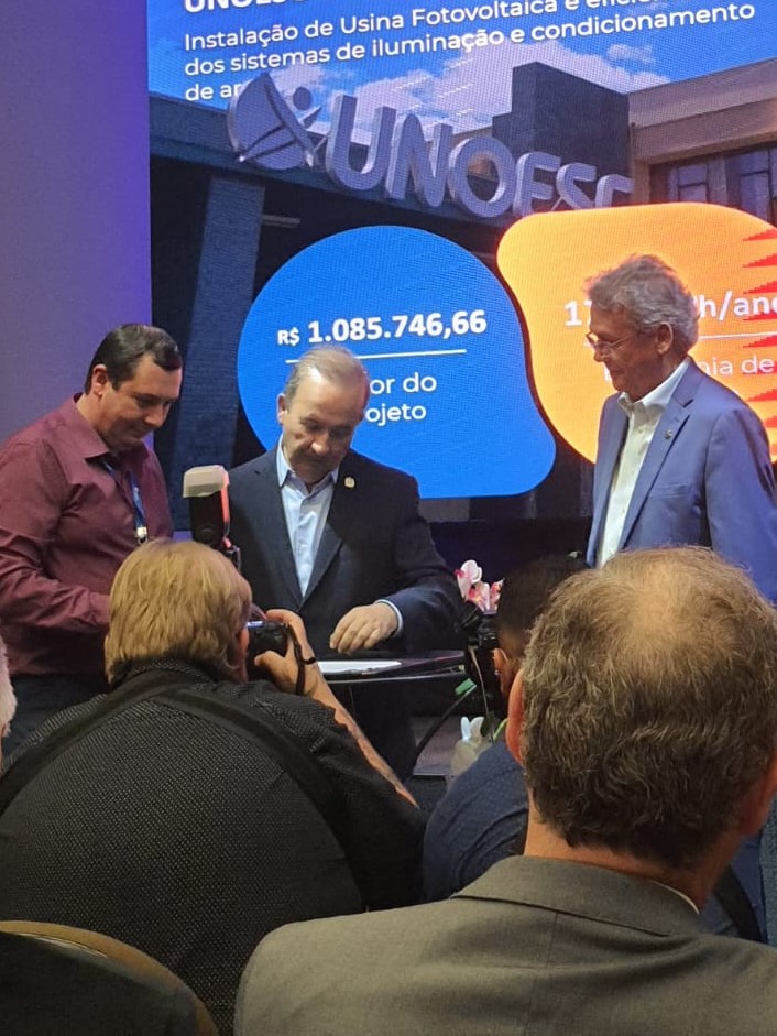 A Unoesc São Miguel do Oeste foi contemplada com um recurso de R$ 1.085.746,66, sendo R$ 770.689,68 em recursos da Celesc e R$ 315.056,98 próprios, por meio do edital do Programa Eficiência Energética (PEE) Aneel/Celesc. O repasse foi oficializado por meio da assinatura da ordem de serviço pelo Governo do Estado e pela Celesc durante evento realizado no dia 28 de novembro, com dez projetos selecionados na chamada pública 2022, que totalizam R$ 12 milhões de recursos destinados ao Programa.