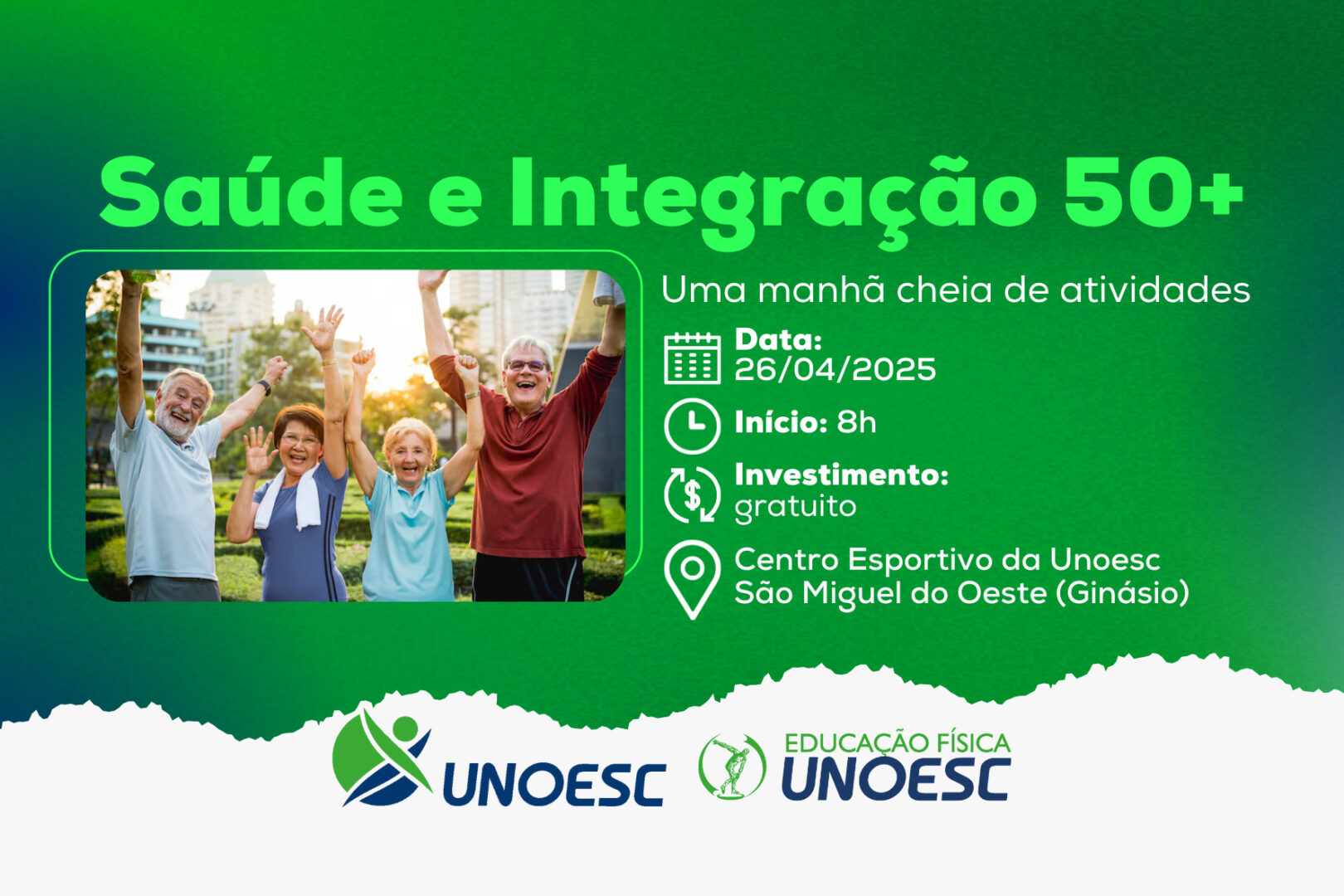 A Unoesc São Miguel do Oeste, por meio do curso de Educação Física, realiza neste sábado (26), a segunda edição do evento Saúde e Integração 50+, a partir das 8h, no Centro Esportivo da Instituição. A iniciativa faz parte das Atividades Práticas de Extensão (Apex) desenvolvidas pelos estudantes da 7ª fase do curso de Educação Física — Bacharelado.