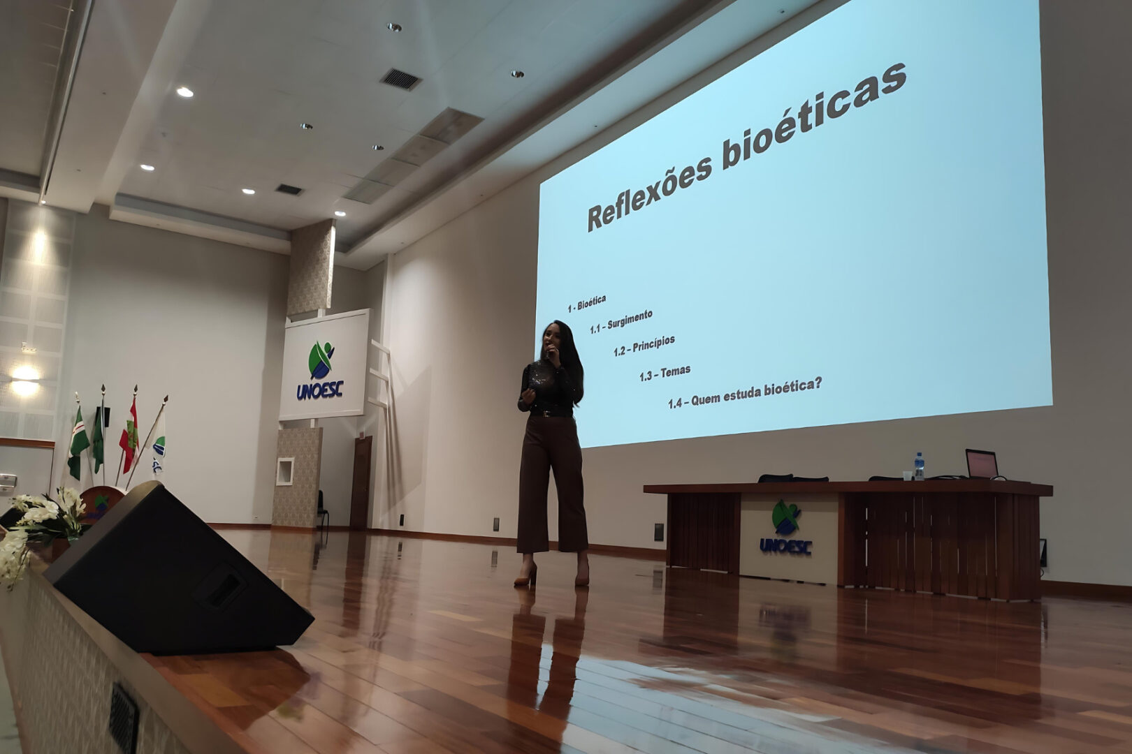 A professora do Curso de Direito da Unoesc São Miguel do Oeste, Daniela Zilio, abordou questões éticas e jurídicas relacionadas à “Bioética na área da saúde”, estimulando reflexões críticas sobre temas como eutanásia, cuidados paliativos, quebra de sigilo, respeito à autonomia do paciente e ética nos procedimentos.
