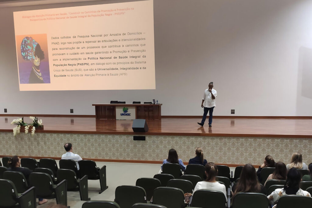 Em seguida, o assessor técnico da Coordenação de Atenção à População Negra do Ministério da Saúde, Jorge Senna, apresentou dados e reflexões na palestra intitulada “A saúde da população negra no Brasil”, destacando os desafios enfrentados e as políticas de saúde. Senna mostrou os índices do IBGE de 2022, que apontam que a população negra é predominante no Brasil, sendo 55,9% autodeclarada negra. Santa Catarina é o Estado com a menor população negra, com 11,7%. Também frisou fatores que interferem no estado de saúde e doença, sendo forte a influência de determinantes sociais, que por questões históricas, barram acessos e acessibilidades de serviços de saúde para a população negra brasileira.