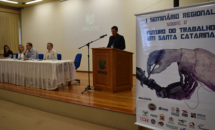 A Unoesc sediou na quinta-feira, 22, o Seminário Regional sobre o Futuro do Trabalho. O evento, que contou com participantes da região Meio-Oeste e Serra catarinense, teve por finalidade discutir o cenário trabalhista do estado, tendo em vista a evolução tecnológica e a forma como ela impacta nas empresas e trabalhadores.