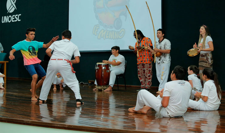 Na abertura, houve a apresentação de acadêmicos da 4ª fase do curso de Educação Física, que encenaram a coreografia Maculelê, sob orientação do professor Diego Gonçalves. Após, a Associação Desportiva Cultural e Artística Capoeira Iê Menino apresentou uma roda de capoeira. Prosseguindo, o professor da Associação, Tiago de Macedo, abordou a palestra com a temática “A capoeira enquanto instrumento formativo: novos olhares para a diversidade”. Finalizando, os professores Anderson José Guisolphi e Elizandra Iop debateram, em mesa-redonda, a temática “Conhecer e respeitar o modo de vida de diferentes grupos sociais, em diferentes tempos e lugares”.